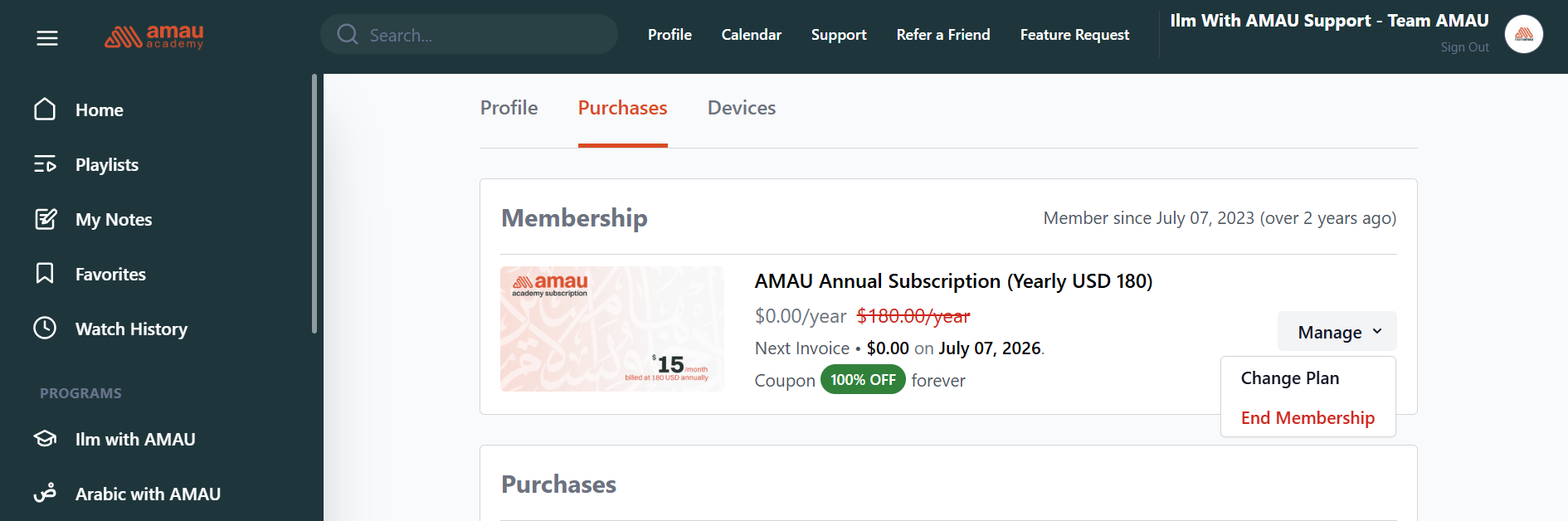 Under Purchases, you will see your current membership (Annual or Monthly).