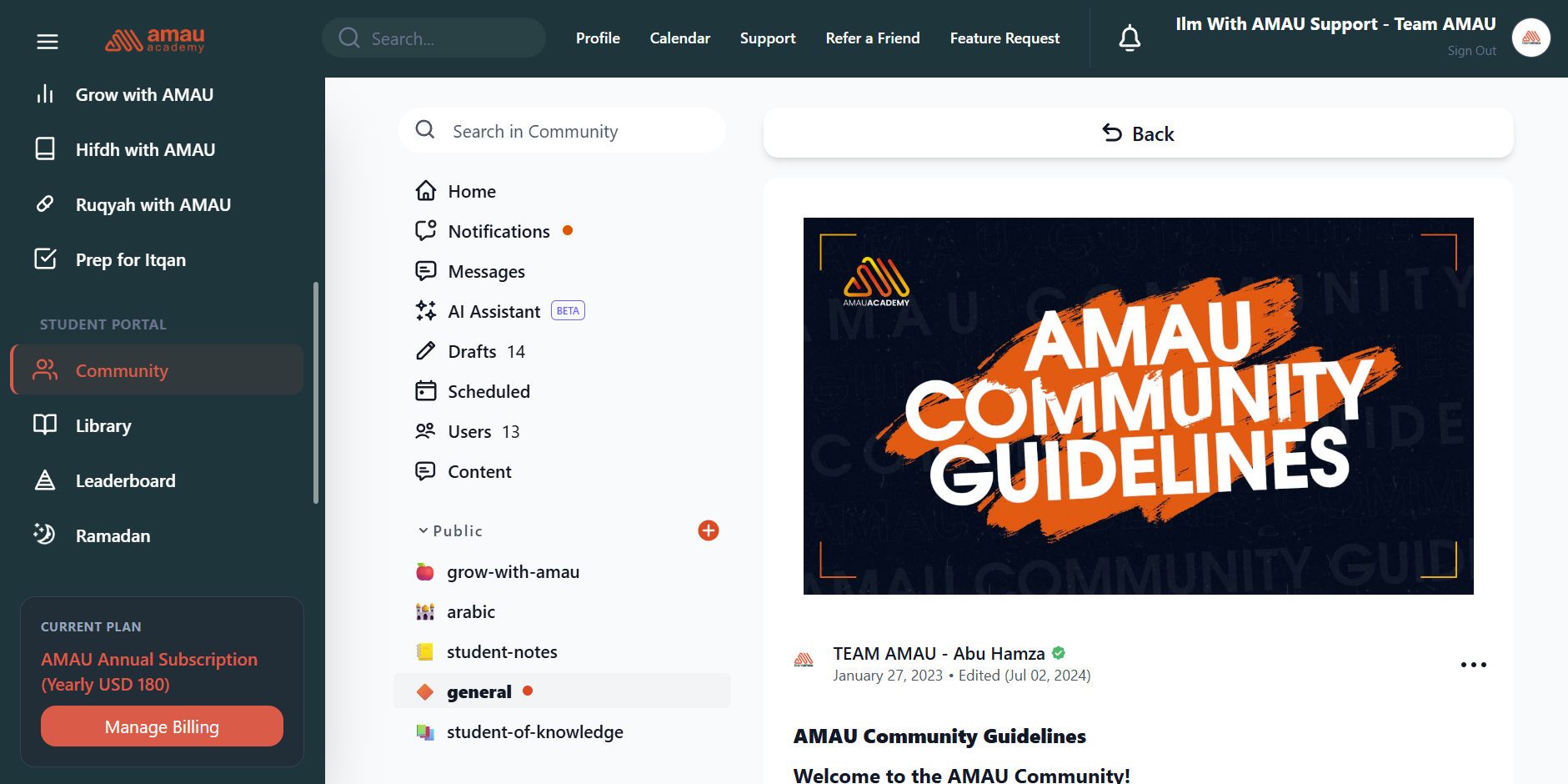 This will take you directly to the AMAU Student Community where you can view posts, discussions, and channels.