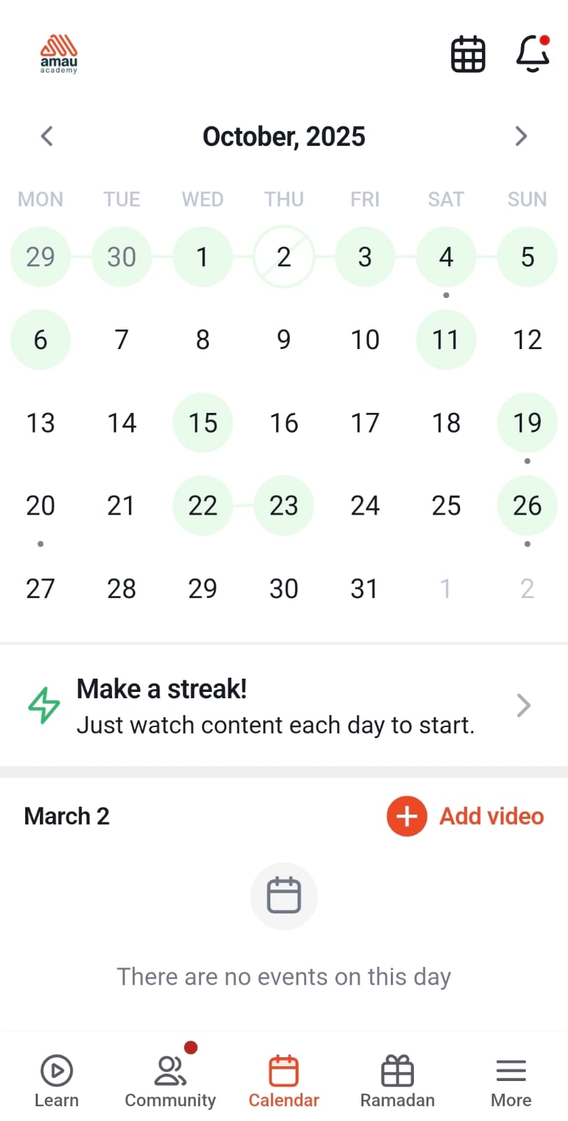 Streaks help you stay consistent in your learning by tracking the number of consecutive days you engage with lessons or live sessions on the AMAU platform.