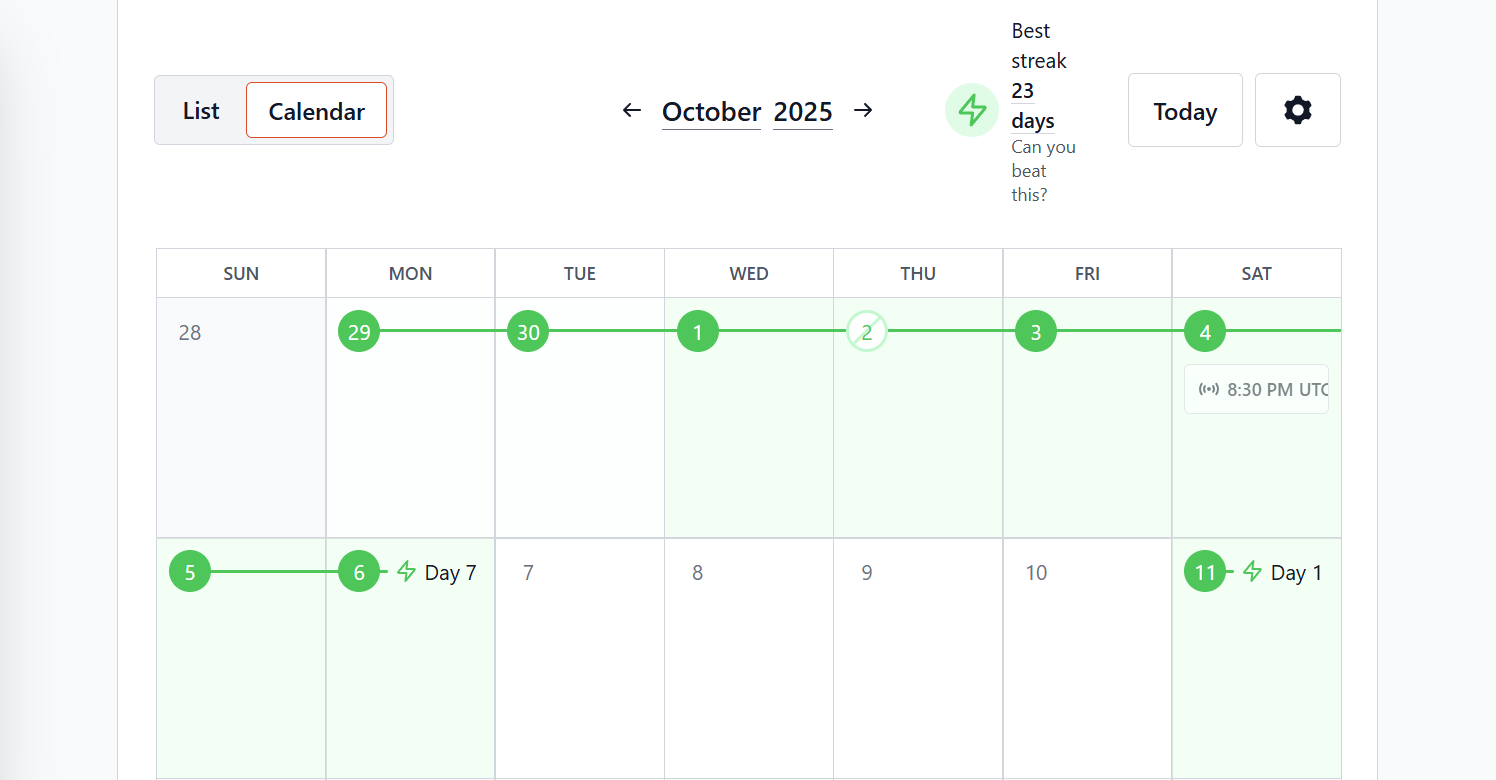 Web Platform Full Calendar View showing your current streak, previous streaks, and best streak.