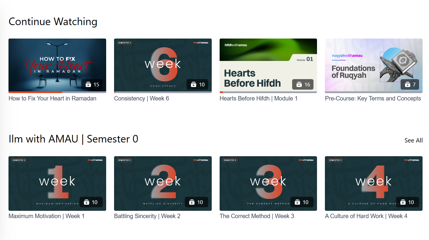 • Explore sections such as Ilm with AMAU, Arabic, Grow, Hifdh, and more